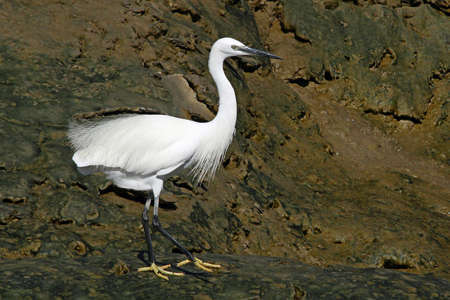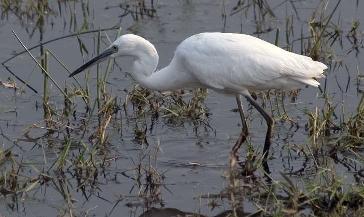 L'aigrette garzette est le "héron blanc" le plus répandu en Europe. Son plumage est d'un blanc pur. On la distingue de la grande aigrette par sa plus petite taille, son bec noir et ses pattes jaunes. L'aigrette garzette peut s'observer sur tous les milieux humides peu profond. Elle a toutefois une préférence pour les milieux saumâtres (eaux légèrement à moyennement salées). Hors des colonies, c'est une espèce relativement muette. En période nuptiale, elle porte sur la nuque deux longues plumes fines (20 cm) : les aigrettes. Comme les autres hérons, cette aigrette se nourrit de petits poissons, d'amphibiens, d'insectes aquatiques et de petits crustacés. Au début du XXème siècle, elle fut longtemps chassée pour ses longues plumes à sa tête. En effet celles-ci servaient d'ornement pour les chapeaux des dames...