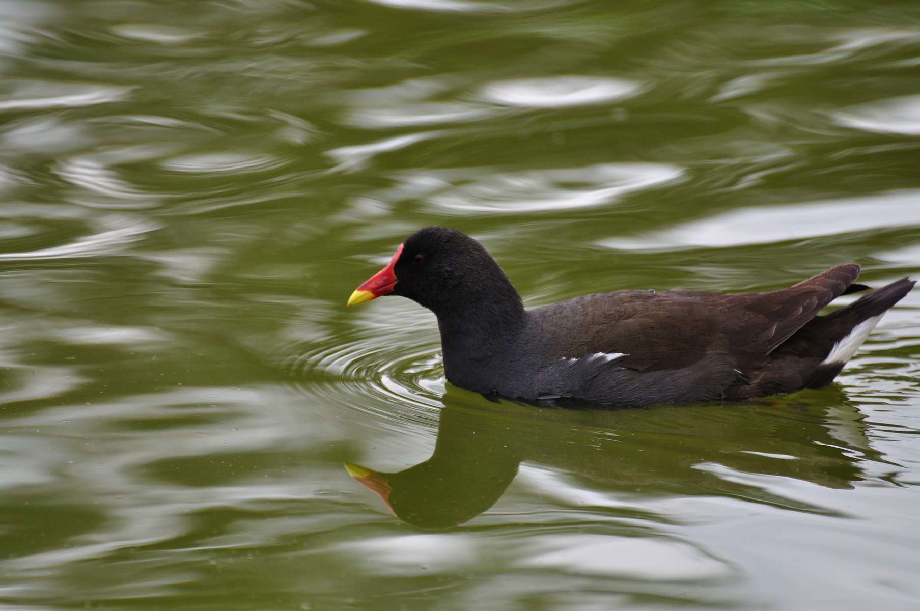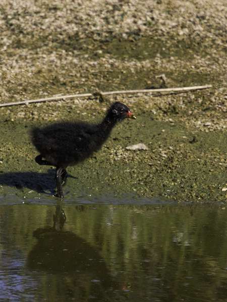 La gallinule poule-d’eau, plus couramment nommée poule d’eau, est un oiseau de la famille des Rallidés au plumage noir ardoisé. Elle possède une bande blanche sur les flancs. Comment reconnaître la poule d'eau, comment la distinguer de la foulque macroule qui lui ressemble ? C'est très facile : son bec pointu est rouge avec l'extrémité jaune, et il se prolonge vers le front par une plaque frontale rouge, ce qui fait de la poule d’eau un oiseau très facile à reconnaître ! De plus, ses yeux sont rouge foncé et ses pattes et doigts sont verdâtres. Les deux sexes sont semblables mais le mâle est légèrement plus grand. Le poussin, quant à lui, est couvert de duvet noir et son bec est rouge avec le bout noir. Pour ce qui est de son chant, la poule d’eau émet souvent des gloussements rapides et répétés en vol et surtout la nuit au printemps. Vous avez peut-être déjà eu la chance d'observer l'envol de la poule d'eau, lorsqu'elle court à la surface avant de décoller. Une fois dans les airs, son vol est rapide et puissant. Où l'observer ? La poule d'eau vit près des eaux douces ou saumâtres (légèrement salées) des zones humides, avec des rives proposant un couvert. Vous pouvez notamment l'observer au niveau des étangs, des marais, des rivières calmes et des lacs, mais aussi dans les eaux des parcs urbains. En ce qui concerne son régime alimentaire, la poule d'eau est omnivore (elle mange de tout) : plantes aquatiques, herbe, feuilles mais aussi mollusques, insectes et poissons font notamment partie de son menu.