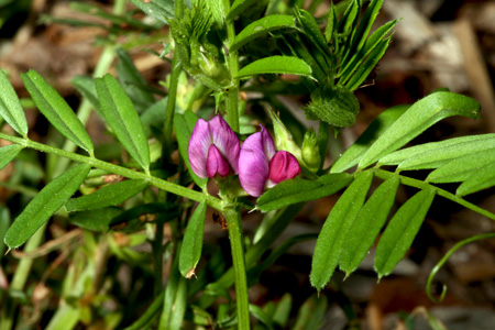 Cette plante vivace de 20 à 40 centimètres de hauteur, sans poil, présente des tiges dressées, et ramifiées. Elles sont ailées, c'est-à-dire qu'elles sont pourvues d'excroissances en forme de lames. Les feuilles sont alternes, bleuâtres en dessous. Les fleurs sont rouges-violacées, regroupées de 2 à 5. Elles comptent cinq pétales. Cette plante fleurit entre Mai et Juillet. Ses fruits sont des gousses comme les haricots. Elle pousse dans les bois et les prés.<br />