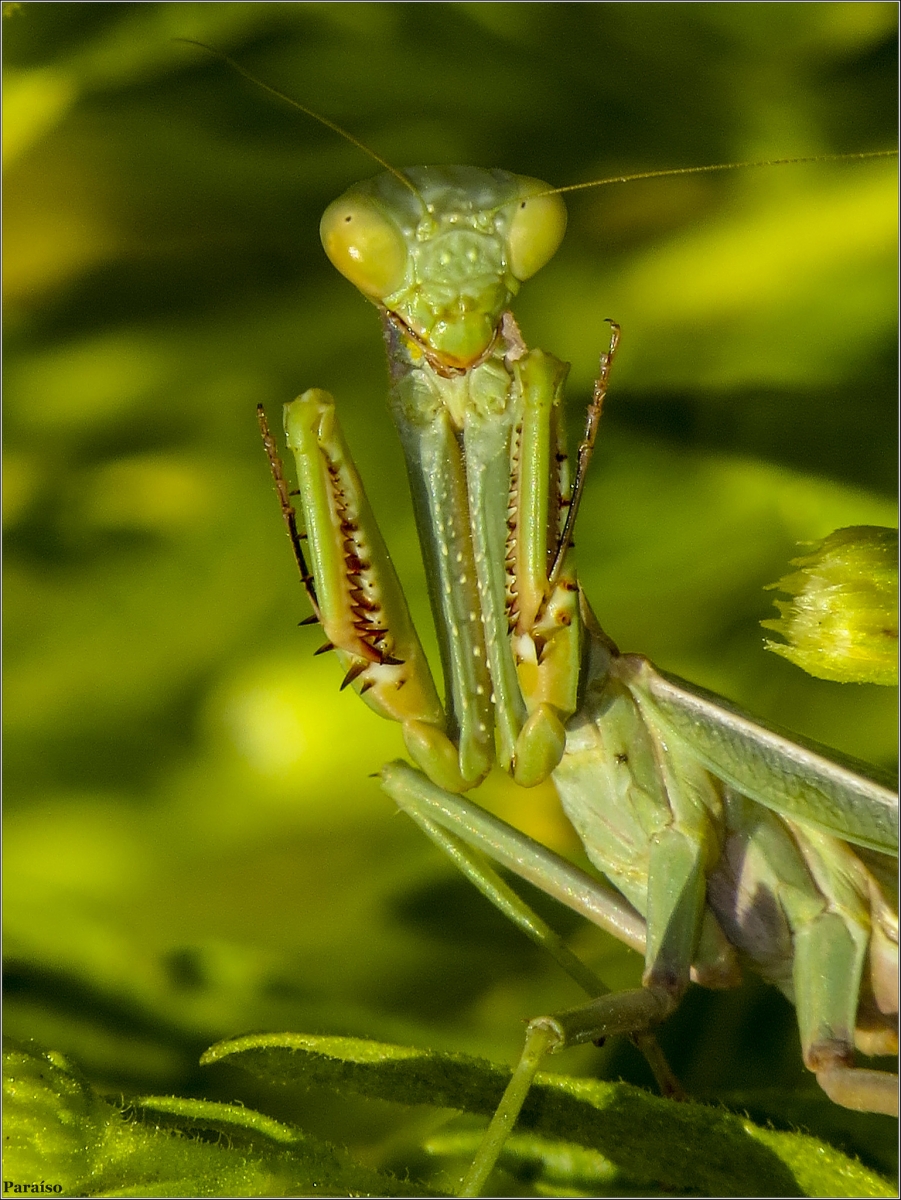 La coloration des ailes est très remarquable, composée de rouge, de noir, de jaune et de violet. Les ailes de la mante ocellée ne sont développées que chez le mâle pour le vole. Si vous en voyez donc une voler après l'avoir surprise sur une branche, c'est sans nul doute un mâle!