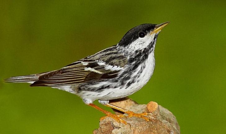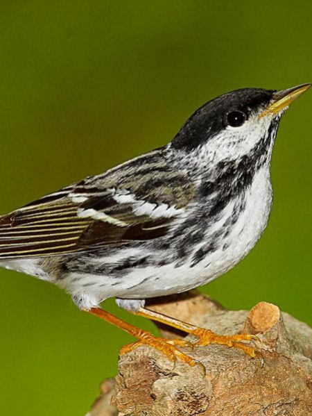 <p class="align-justify" style="margin-bottom: 0cm">Le dessus de la tête est noir et la joue blanche. Une ligne noire sépare la joue et la gorge. Comme l’évoque son nom, la Paruline rayée a le dos et les flancs rayés de noir et de gris. La femelle adulte a la calotte et le manteau d’une teinte gris verdâtre, un sourcil blanchâtre, et une rayure oculaire foncée. La calotte noire et la joue blanche la distinguent de la Paruline noir et blanc. Parmi les parulines elle fait l’une des plus longues migrations. En provenance d’Amérique du Sud elle peut voler durant 80 à 90 heures sur une distance de 3 000 à 8 000 km. Elle arrive dans l’archipel à partir de la mi-mai où de nombreuses mentions de nidification ont été rapportées. (Taille : 13 cm).</p>