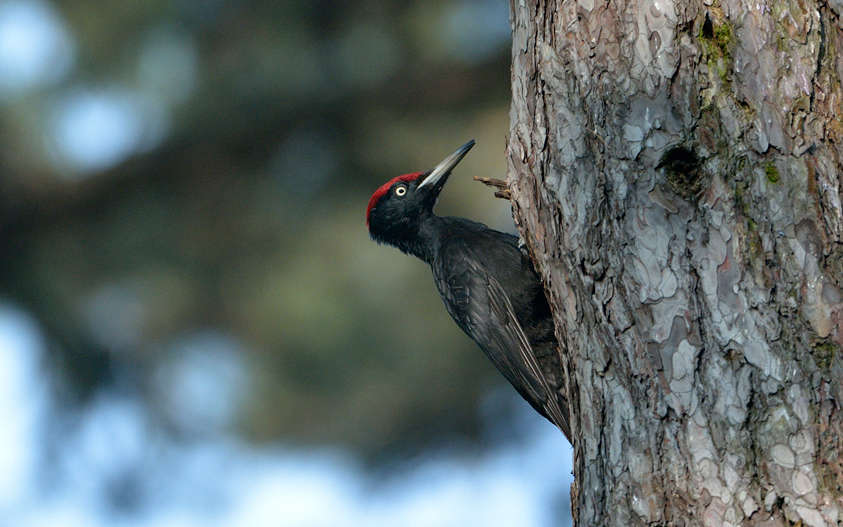 Avec une taille de 46 cm de long, le pic noir est le plus grand des pics européens. Vous le reconnaîtrez très facilement : il possède un plumage entièrement noir, excepté une calotte (dessus de la tête) rouge.