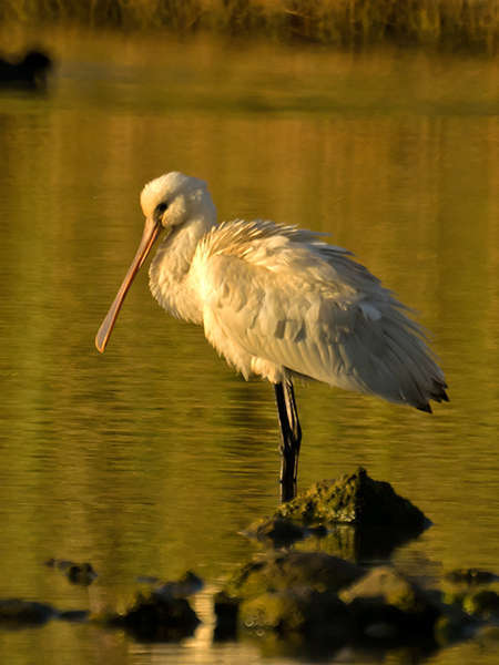 La Spatule blanche est un grand échassier blanc immédiatement identifiable à son long bec en forme de spatule. Ce bec lui permet de remuer la vase et d'avaler du plancton. Elle se nourrit également de petits poissons, d'animaux aquatiques et de végétaux. Par sa forme arrondie, le bec de la spatule blanche est un outil efficace et original. Elle s'en sert en le déplaçant de droite à gauche dans l'eau, ainsi tout élément nutritif qui passe à l'intérieur est immédiatement saisi. Le bec de cet oiseau est aussi long que son cou.