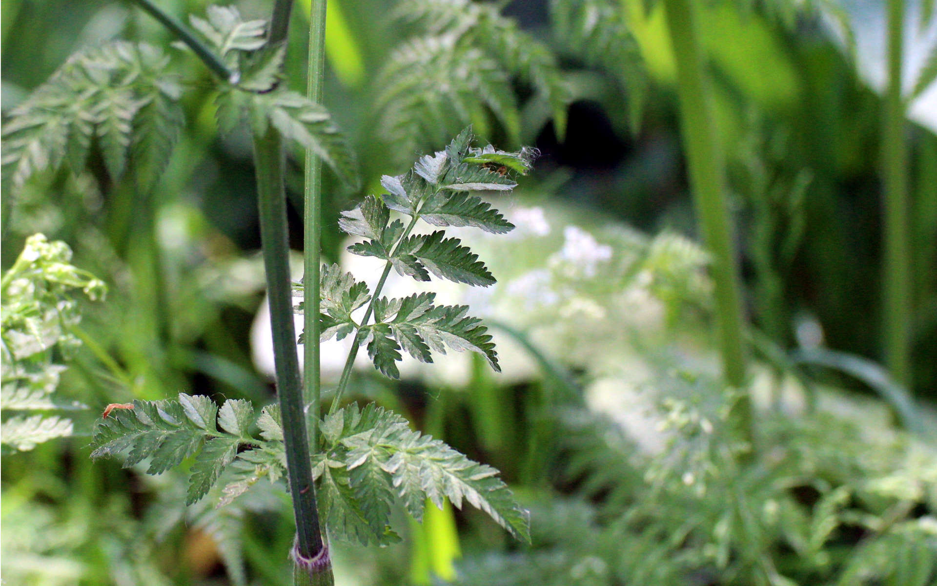 <p>Le cerfeuil des bois est une plante vivace qui ressemble et fait partie de la même famille que les <a href="http://www.ecobalade.fr/espece/grand-boucage">boucages</a> (anis, fenouille, cumin, etc). Très commune, elle peut atteindre jusqu'à 1,5 m de haut. Les feuilles sont composées de plusieurs petites feuilles appeler folioles qui sont très dentées. Les fleurs blanches sont regroupées toutes ensemble formant une sorte de parasol appelé ombelle. Celles-ci fleurissent d'avril à juin et sont visibles dans les haies, les bords de routes, talus, lisières...</p>