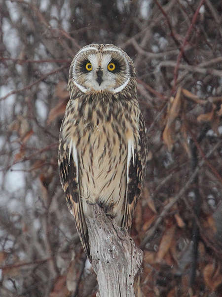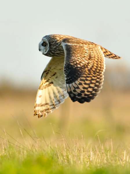 <p>Le Hibou des marais ou Hibou brachyote (Asio flammeus) est une espèce de rapace nocturne appartenant à la famille des Strigidées. Il s'agit d'un rapace diurne et nocturne de 37 cm de long et 100 cm d'envergure. Il a un plumage brun chamoisé parsemé de stries noires. Les femelles sont plus foncées que les mâles. Le hibou des marais possède deux demis-disques fasciaux blanchâtres avec au centre ses yeux jaunes cerclés de noirs. </p>
